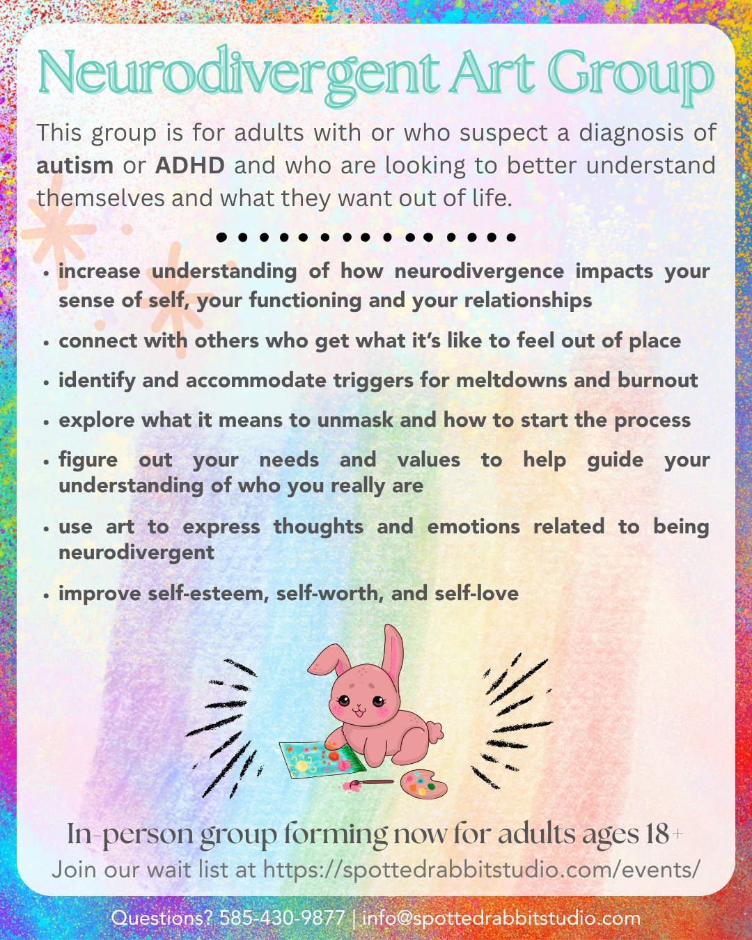 We’ll use open-ended and directed art-making to actively work on identity development, emotional expression, and social connection while learning more about the ways autism and ADHD impacts our emotions, thoughts, and behaviors. As always here at Spotted Rabbit, our goal is to help folks embrace authenticity and build a life aligned with their own personal needs and values.